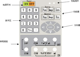 | | | ● 液晶显示屏:显示测量及输出信号的相关信息。 | ● 电源开关:按下电源 ON 开关,接通电源。 OFF 关断电源。 | ● 键盘: | ⑴ 数字区:直接输入要输出的量或查询的值。 | ⑵ :主画面和查询画面时设定光标位数值,参数设定时选择要修改的参数项。 | ⑶ :设定光标位。 | ⑷ ENT :回车键,确定选定的项操作有效 | ⑸ ESC :在主画面时进入热工宝典查询,参数设置时为退出参数设置画面。 | ⑹ FUN :测量或输出的类型切换。测量时由 DCV 、 DCmA 、 DCmV 、 RTD 、 TC 、 F 顺序循环切换。 | 输出时由 DCV 、 DCmA 、 DCmV 、 TC 顺序循环切换。 | ⑺ Range :测量或输出中的 RTD 、 TC 的类型范围切换。 RTD 由 Cu50 、 Pt100 顺序切换, TC 由 S 、 K 、 E 、 T 、 | J、 B 、 R 、 N 顺序切换。 | ⑻ Zero :输出值复位为 0 。 | ⑼ ON 、 OFF :电源开关。按下 ON 2 秒钟,电源开关接通。 | ● 输入输出端子 | 端子分为 OUT 区和 IN 区, OUT 区作为信号输出用, IN 区为信号测量用。红色的端子为正级,黑色的端子为负极。 | 3.2 顶端面图 |
